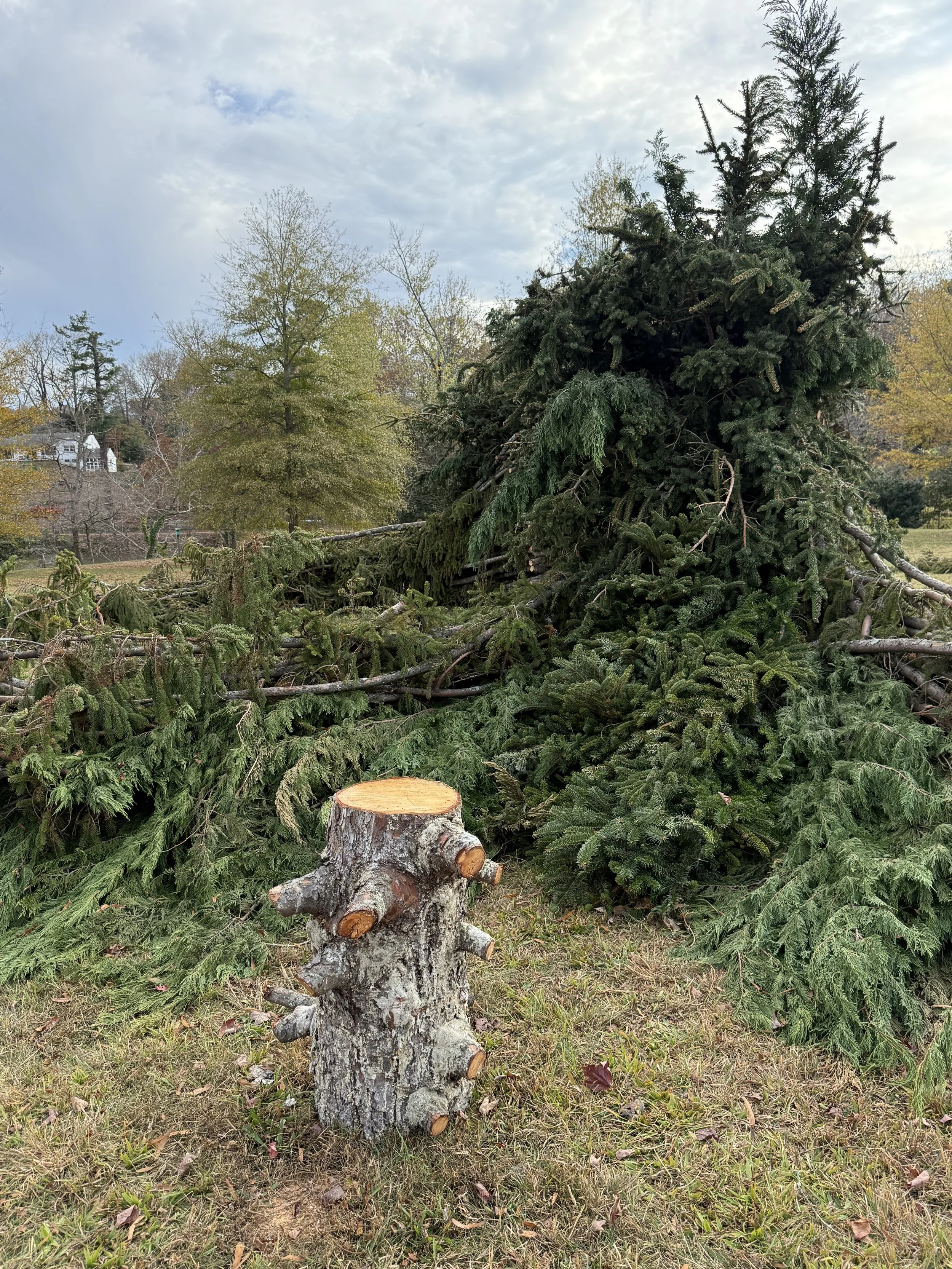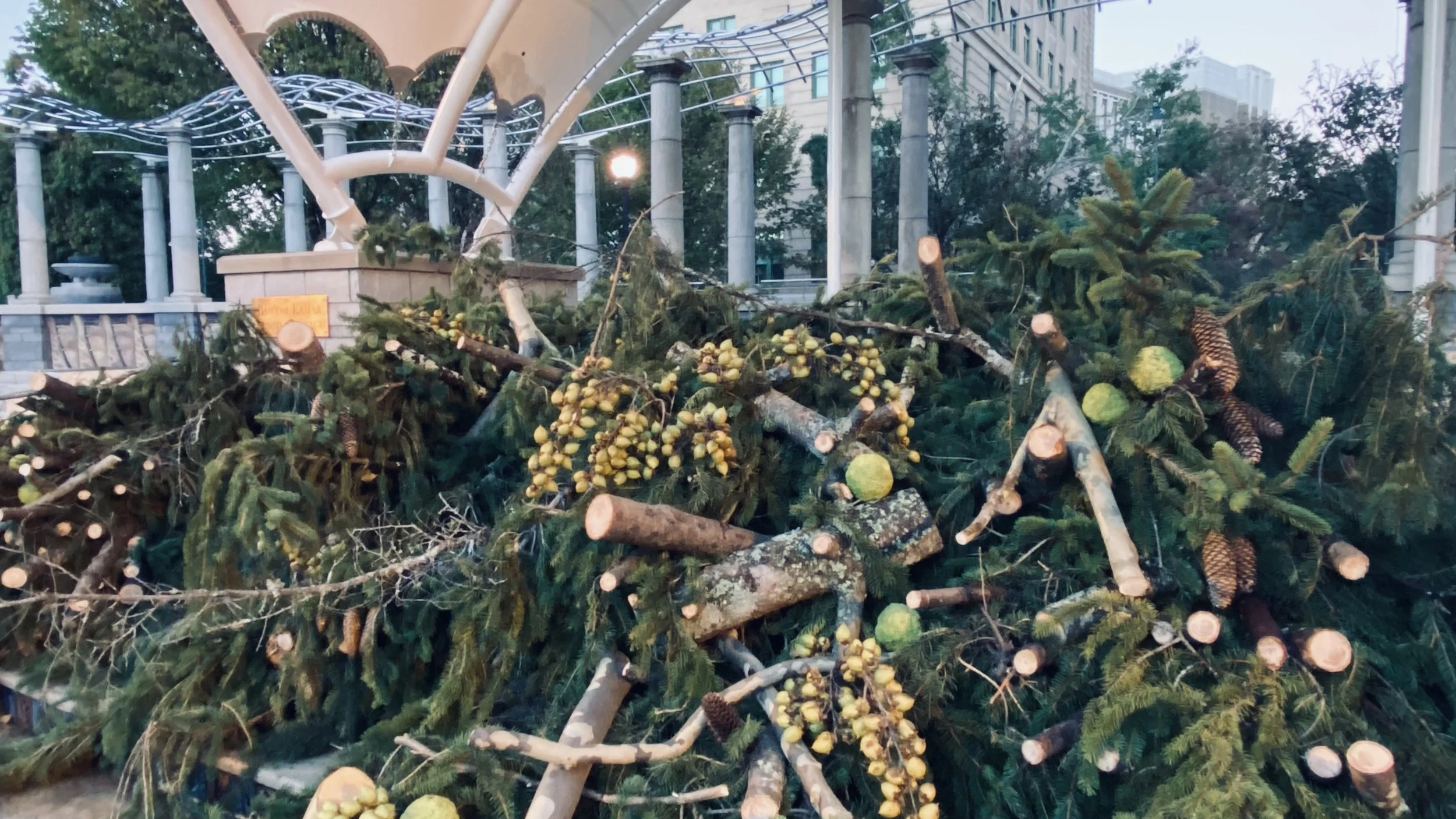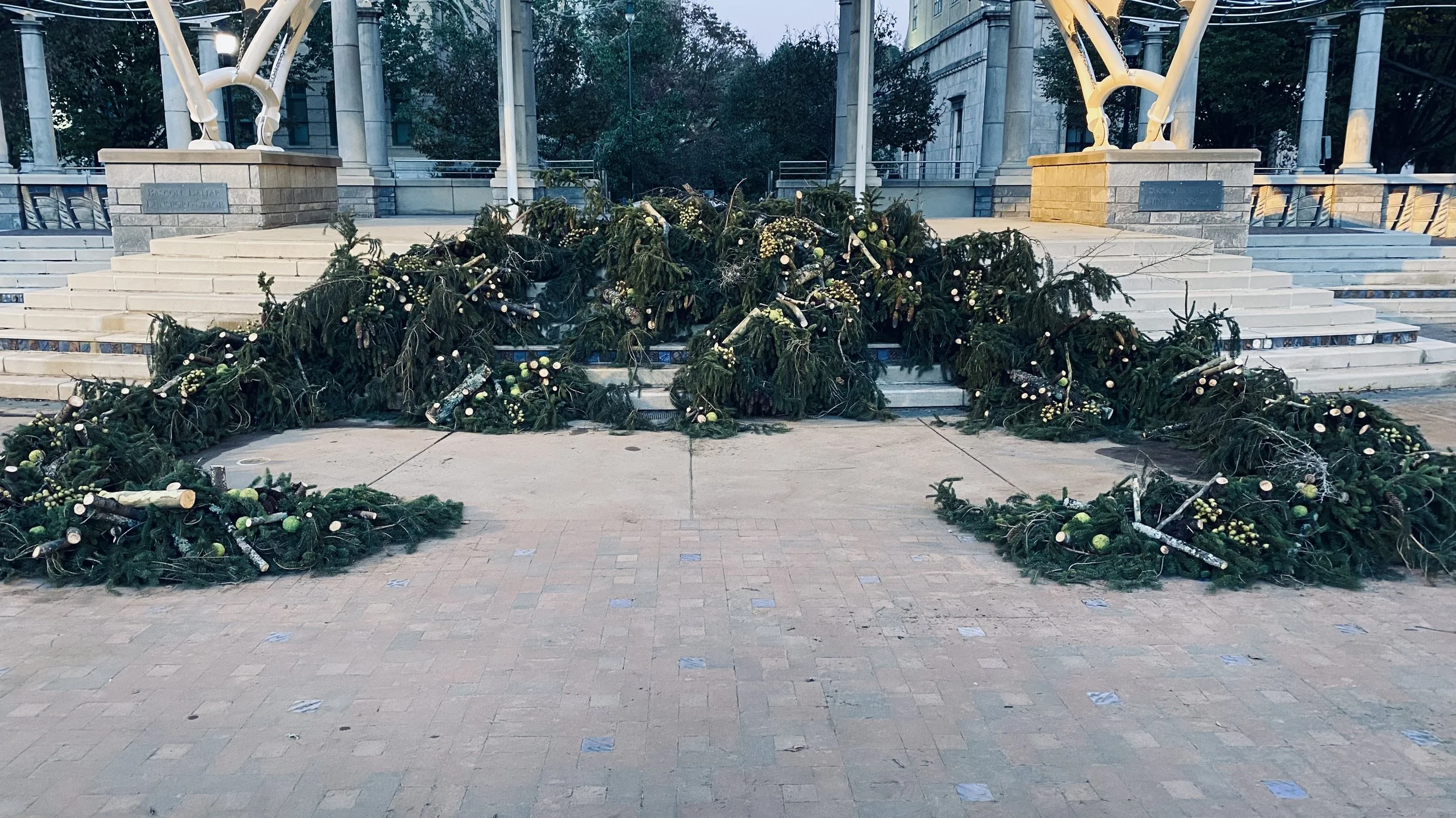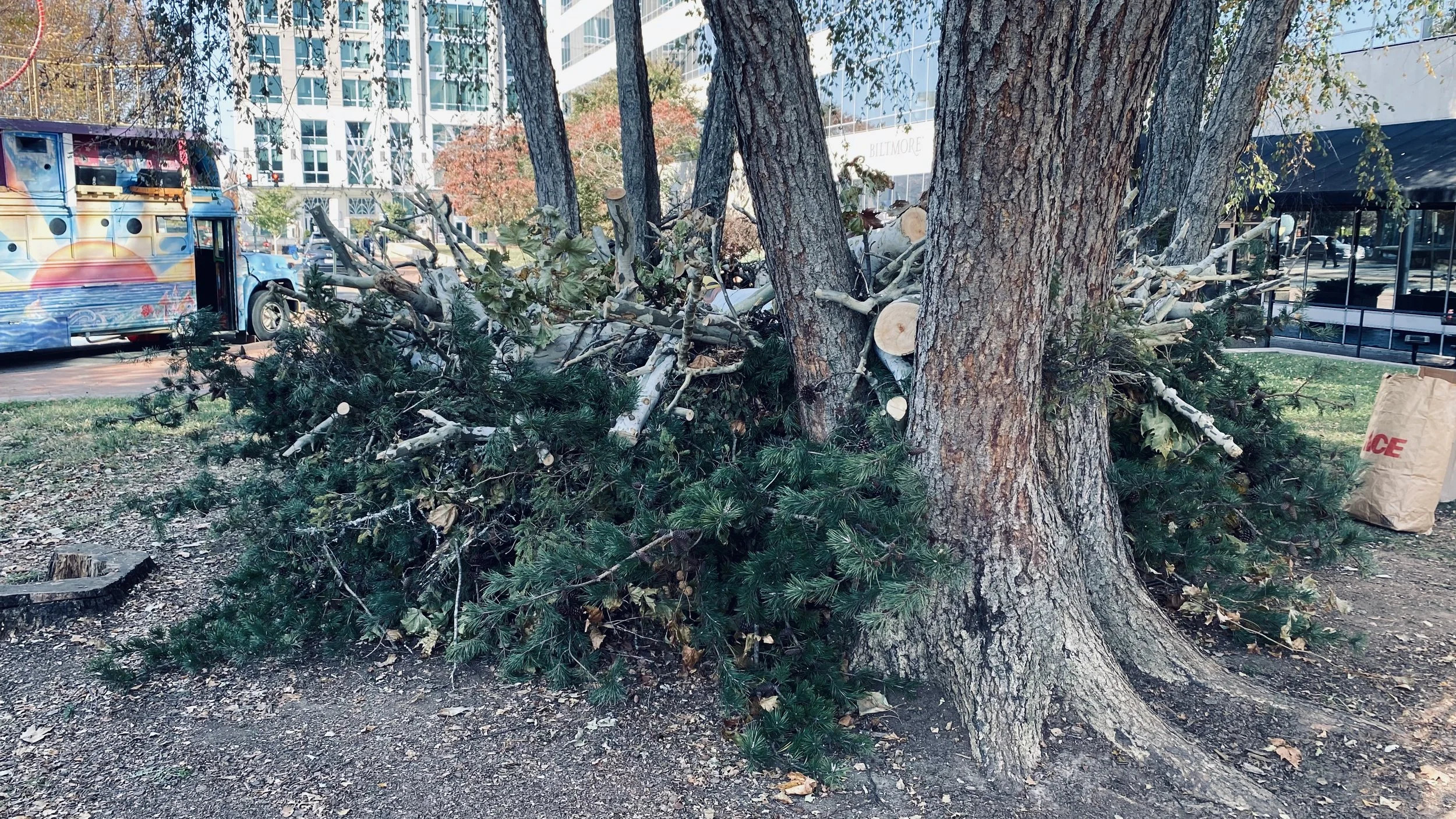 Tony Bayles used the large fallen evergreen in Pack Square as the foundation of the altar. This tree, which had been brought down by the hurricane's force, was repurposed to serve as a symbol of both loss and resilience. The design of the altar combined elements of natural beauty and the spiritual, with the tree providing a solemn yet profound connection to nature and the community.